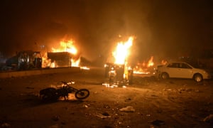 Burning vehicles after bomb blast in Quetta, Pakistan on Sunday. Photograph: Naseer Ahmed/Reuters