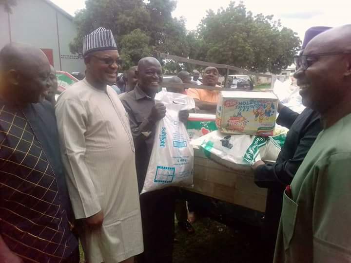 The PDP delegation donated 100 bags of rice, 100 cartons of indomie noodles, 40 bags of salt, 30 cartons of vegetable oil, 10 cartons of bathing soap and 10 sacks of detergent for donation to flood victims.