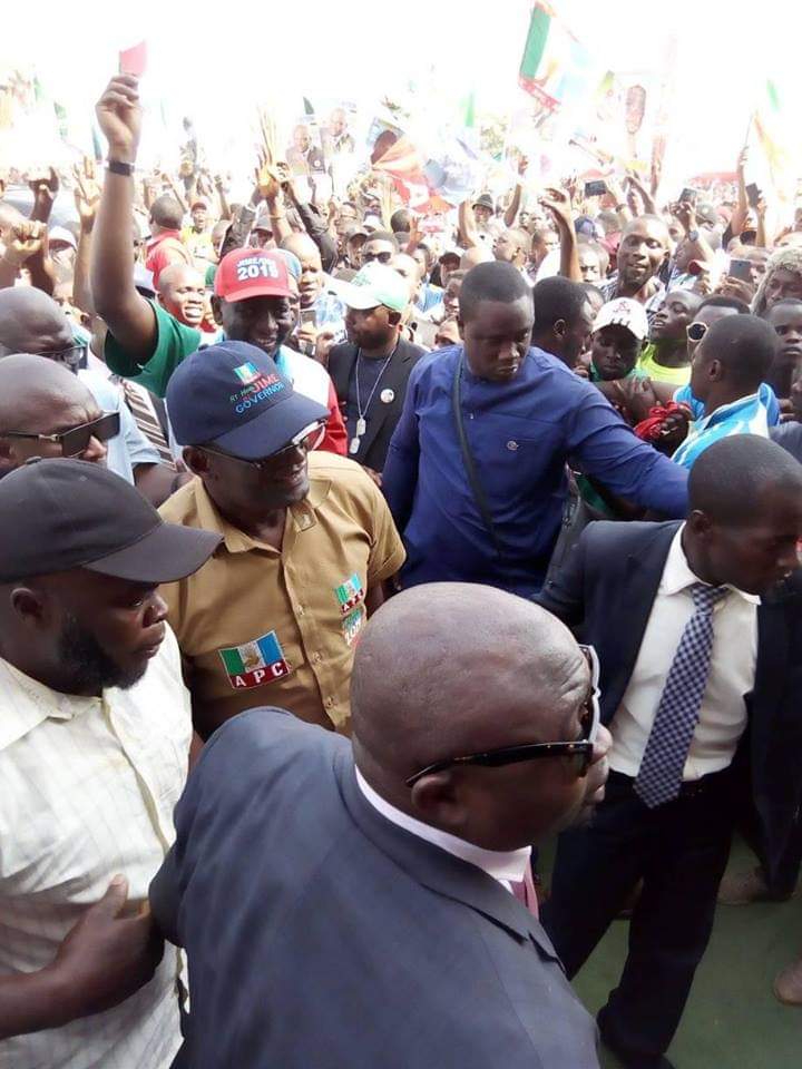 Security operatives were overwhelmed while trying to control a mammoth that thronged the Rwang Pam Township Stadium Jos, venue of President Muhammadu Buhari re-election campaign flag off.